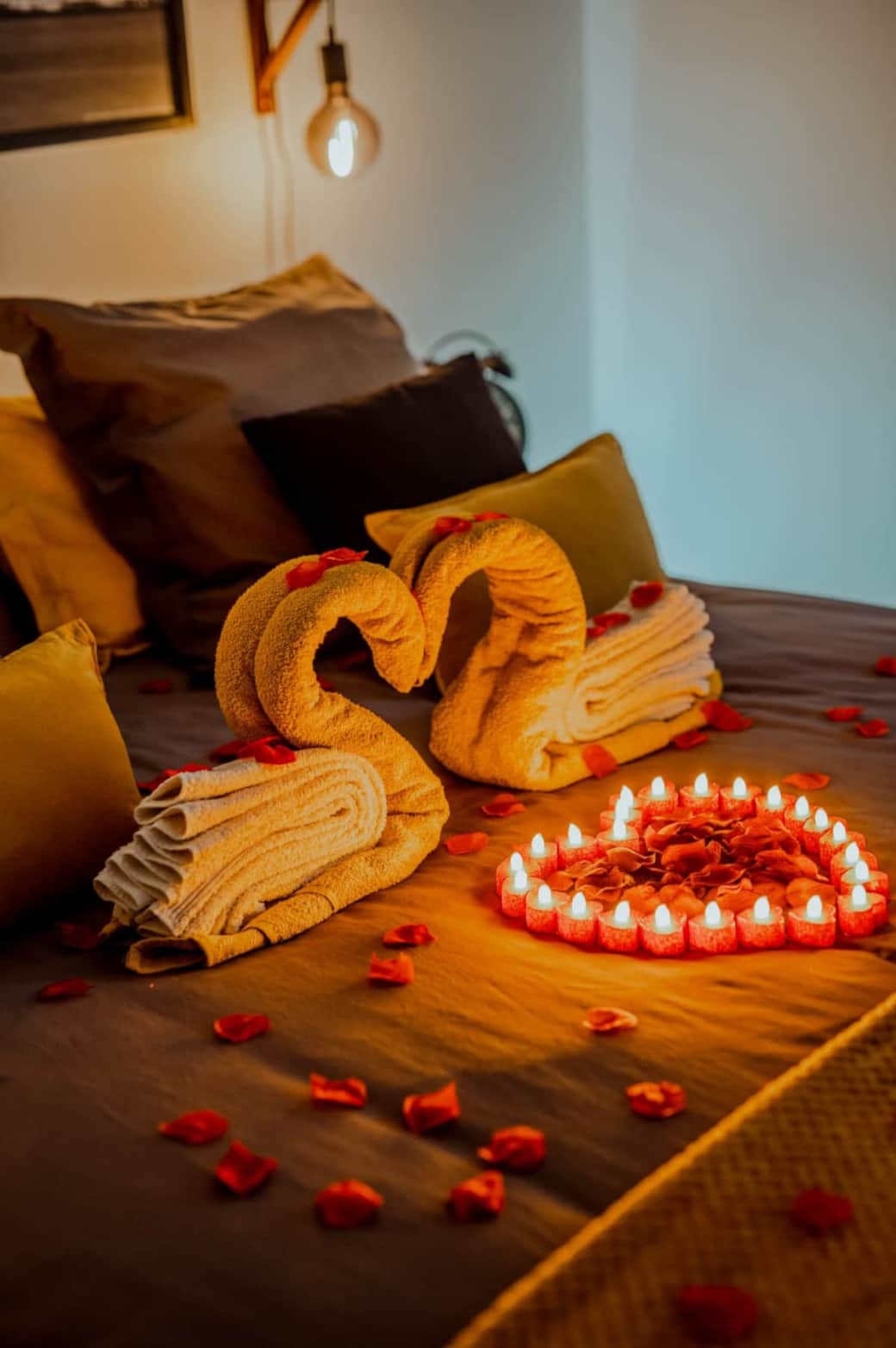 Profitez d'une mise en scène romantique avec pétales de roses et bougies LED pour une arrivée inoubliable